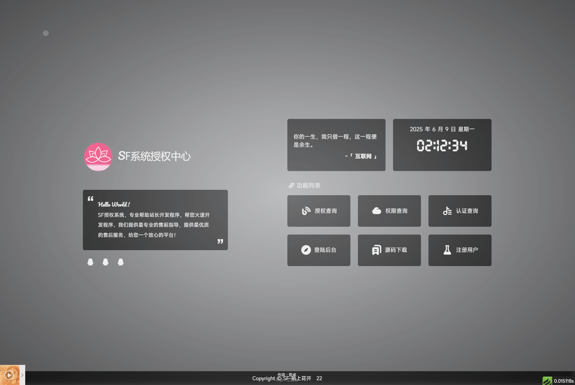 最新SF授权系统源码 全开源无加密v5.2版本耗子关注私信2673618 简介: 最新SF授权系统源码 全开源无加密v5.2版本 SF多应用综合验证系统是一款基于 thinkphp V6.0.9 和 EasyWeb iframe开发的系统 帮助开发者快速为自己的项目增加授权验证。傻瓜式一键安装系统,轻松几步即可完成软件对接 为软件提供用户注册登陆、软件收费授权、软件更新、等一系列专业管理操作。运行环境要求PHP7.1+ 安装教程: 测试环境:Nginx + PHP7.4 + MySQL 运行目录选择public 伪静态设置为thinkphp 访问域名即可跳转至安装界面 图片: 最新SF授权系统源码 全开源无加密v5.2版本此内容为付费资源,请付费后查看库币9.99赞助月卡会员免费赞助永久会员免费登录购买本站唯一网址:https://www.ccy.cx赞助仅是对本站的喜爱,非任何商业行为付费资源© 版权声明 ©版权声明 1 本站点名称:超次元库 2 本站点永久网址:https://www.ccy.cx 3 根据《计算机软件保护条例》规定:为了学习和研究软件内含的设计思想和原理,通过安装、显示、传输或者存储软件等方式使用软件的,可以不经软件著作权人许可,并不向其支付报酬。不能作为侵权; 4 从本站点提供的下载地址下载的软件大部分资源来源于国内外各大媒体和网络,版权争议与本站点无关,所有内容及软件的文章仅能作为用户学习研究目的使用,不能用于任何商业途径或者非法用途,所有软件和资源请在您下载后24小时内删除,否则,一切后果请用户自负! 5 本站点不直接销售或售卖任何软件产品,用户通过本站点赞助费用下载资源,所支付的赞助费用主要是为补偿我们在资源收集、整理、审核及提供下载服务过程中所投入的辛勤劳动费用和成本费用,而非直接购买软件的费用。 6 如果您喜欢该程序,请支持正版软件,联系官方购买正版,得到更好的正版服务!软件版权归属原作者、企业、原出处所有,如需商用请联系版权作者; 7 本站点仅提供一个资源共享的平台,将不对任何资源负法律责任。若无意中侵犯到您的版权利益,请第一时间联系站点负责人并出示版权证明以便及时删除,感谢理解!!E-mail: 邮箱复制提示 oneduanju@qq.com 8 本站点资源大多存储在网盘,如发现链接失效,请联系我们站点人员。我们会第一时间更新! THE END网站源码 喜欢就支持一下吧点赞618 分享QQ空间微博QQ好友海报分享复制链接收藏